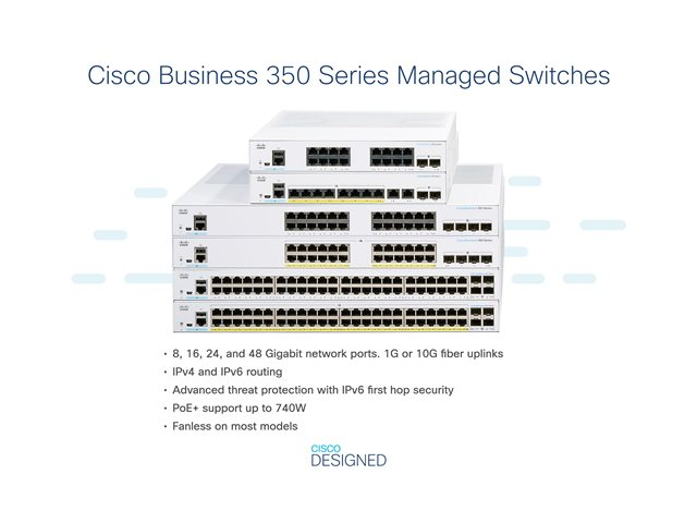 Cisco Business 350-seriens switchar är prisvärda hanterade switchar som ger viktiga byggstenar för alla små kontorsnätverk. Intuitiv instrumentpanel förenklar nätverksinställningen och avancerade funktioner påskyndar digital omvandling, medan genomgripande säkerhet skyddar affärskritiska transaktioner. Switcharna i Cisco Business 350-serien ger den perfekta kombinationen av prisvärdhet och kapacitet för små kontor och hjälper dig att skapa en mer effektiv, bättre uppkopplad arbetsstyrka.